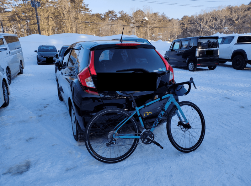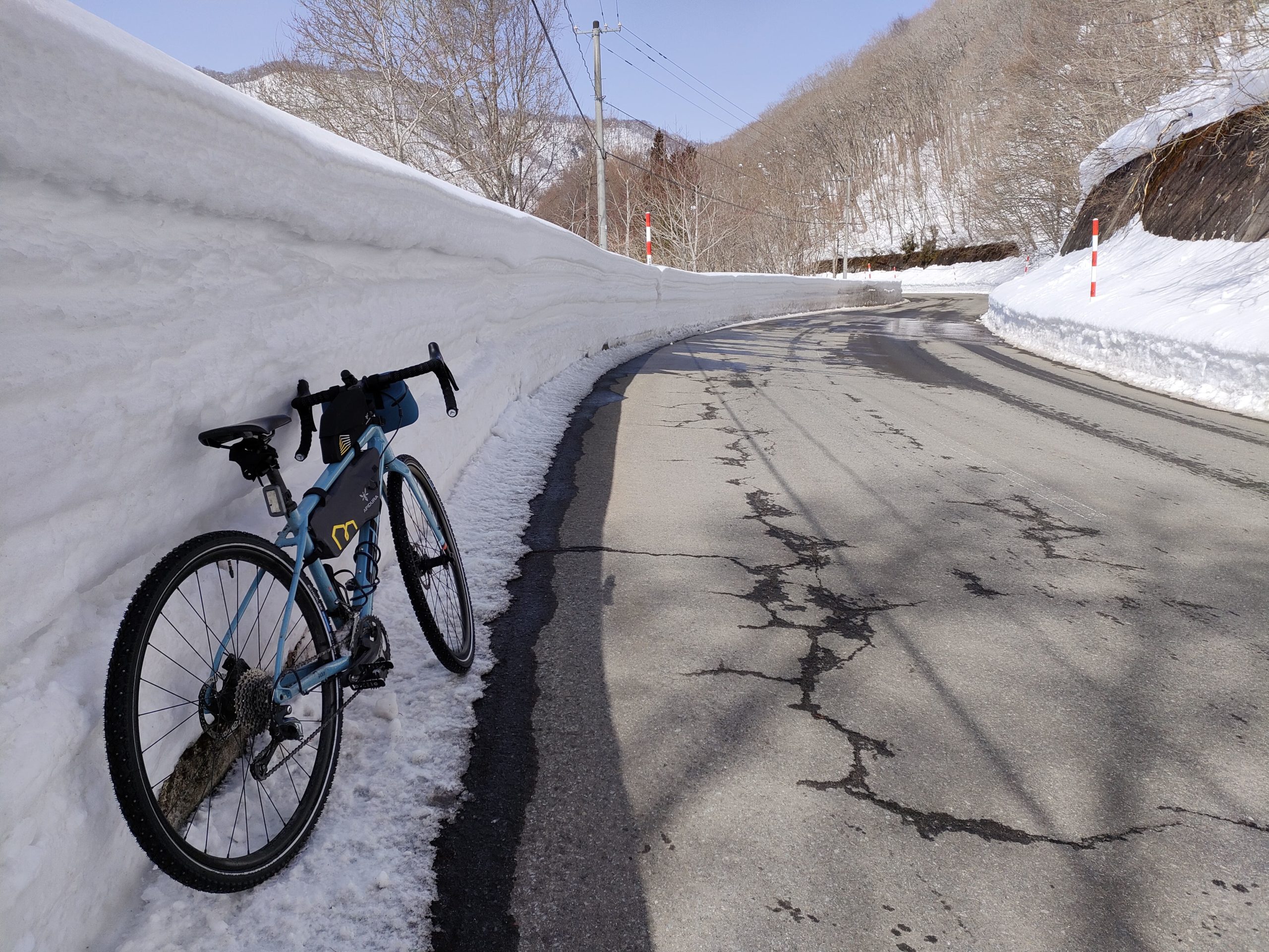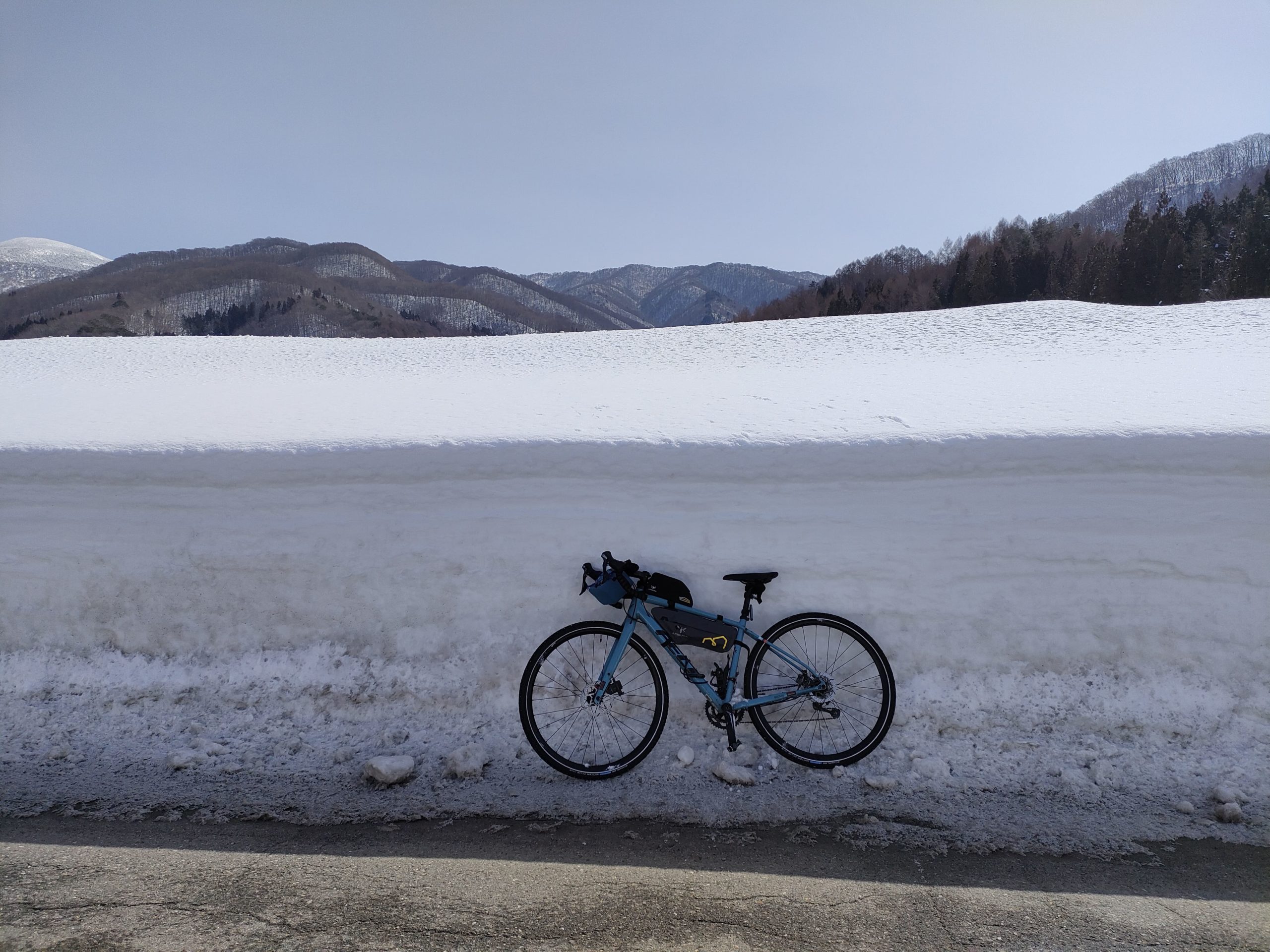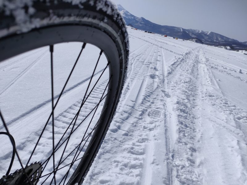 ・筆者はグラベルロード(FELT ’19 BROAM 40 (510)、スパイクタイヤ装着(Marathon Winter Plus 700x40c )で走行したが、ジェットスキー跡でも雪が深いところはペダルが重く、歩くしかなかった。
