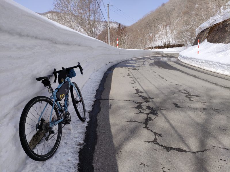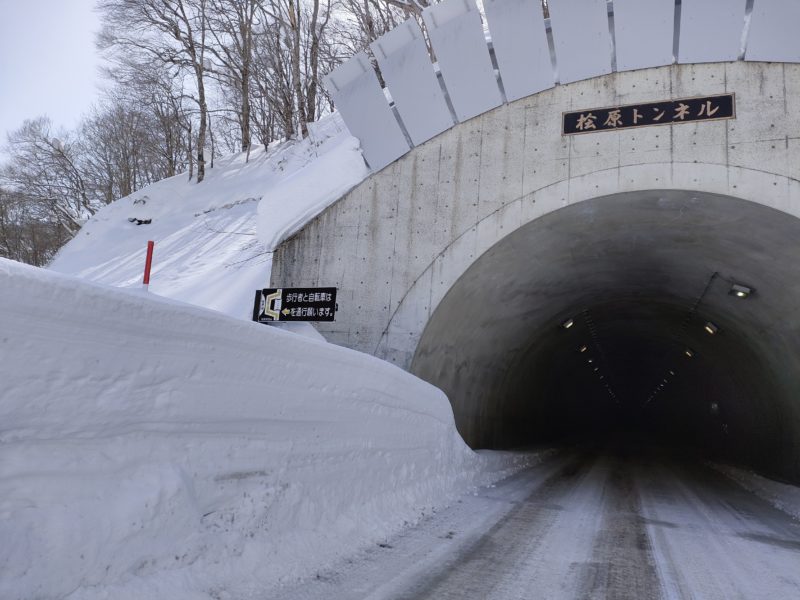 ・桧原湖沿岸路にはトンネルがある。トンネル脇には自転車等向けの迂回路があるが、積雪時は写真のとおり通行不可。車に注意しながら、ライトを付けてトンネルを走ろう。
