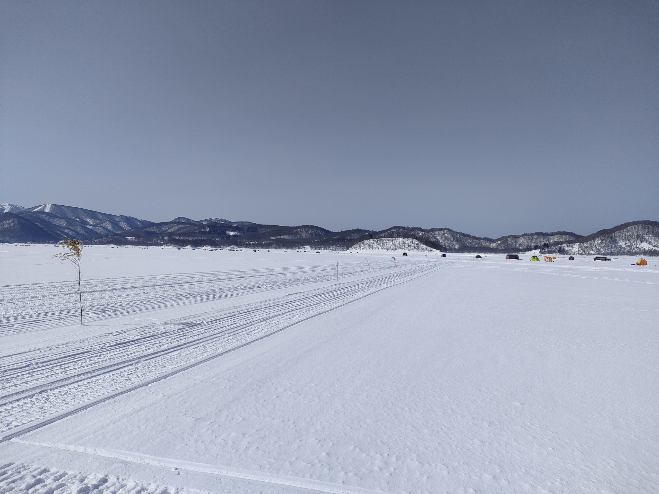 ・ジェットスキーはワカサギ釣り客の送迎で行き来している。ジェットスキー跡を走っていると目印の草木があり、その先には釣り用のテントが設営されている。